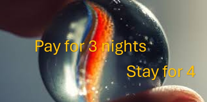 Book a midweek stay, Monday to Thursday and only pay for three nights. Applies for stays booked direct on this site only between May 2025 and September 2025 and not valid for public holidays.
